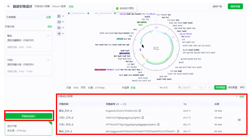自动设计一键开启,引物参数与顺序、名称灵活调整,定制场景随意切换,成果一键保存,通过智能算法辅助您的科研工作,帮您节约时间、提高效率的同时还可以保证实验数据的完整性和可追溯性。