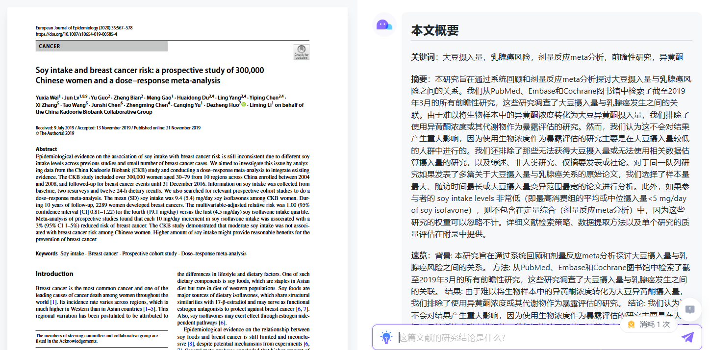 依托【生物医药AI大模型】打造的行业级应用,精准解读文章,预置多个问题,安全可靠,历经大量的的生物医药专业训练,为科研者们全面提效,精准助力。