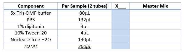 For 110μL, mix 1.1μL 10% Tween-20,1.1μL 10% IGEPAL CA-630, 1.1μL 1% digitonin, 106.7μL 1x RSB.