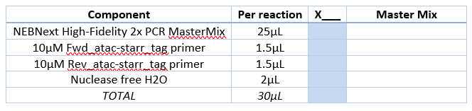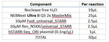 PCR amplify vector backbone from the hSTARR-Seq_ORI plasmid (Addgene #99296) with the mixture and thermocycler conditions below.
