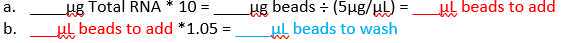 *The magnetic beads are supplied at 5mg/mL and each mg can bind up to 5μg Poly(A)+ RNA. We will assume that Poly(A)+ RNA makes up about 5% (this is at the higher end because we are accounting for both mRNAs and the Reporter RNAs). Therefore, for 100μg Total RNA, we expect 5μg to be Poly(A)+ RNA. To capture all 5μg, we need 1mg of magnetic beads. Therefore, the ratio is 1μg Total RNA:10μg beads.