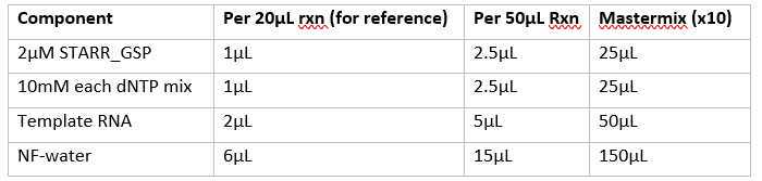 Add 25μL of the MasterMix to each of the 10 RNA-Primer reactions. Mix well.