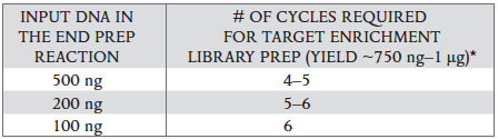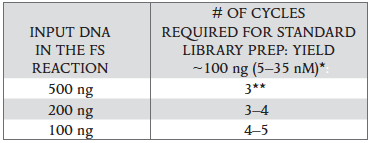 The number of PCR cycles recommended in Table 2.4.1 are to be seen as a starting point to determine the number of PCR cycles best for standard library prep samples. Use Table 2.4.2 for applications requiring high library yields, such as target enrichment. The number of PCR cycles should be chosen based on input amount and sample type. Thus, samples prepared with a different method prior to library prep may require re-optimization of the number of PCR cycles. The number of cycles should be high enough to provide sufficient library fragments for a successful sequencing run, but low enough to avoid PCR artifacts and over-cycling (high molecular weight fragments on Bioanalyzer).