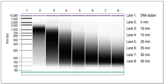 Fragmentation occurs during the 37°C incubation step. Use the chart below to determine the incubation time required to generate the desired fragment sizes. Incubation time may need to be optimized for individual samples. See Figure 2.1 for a typical fragmentation pattern.