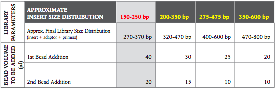 To select a different insert size than 200 bp, please use the volumes in this table: