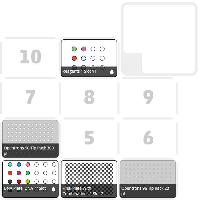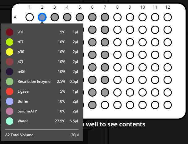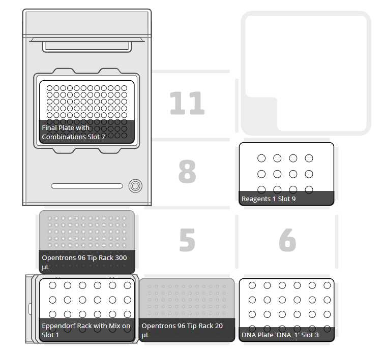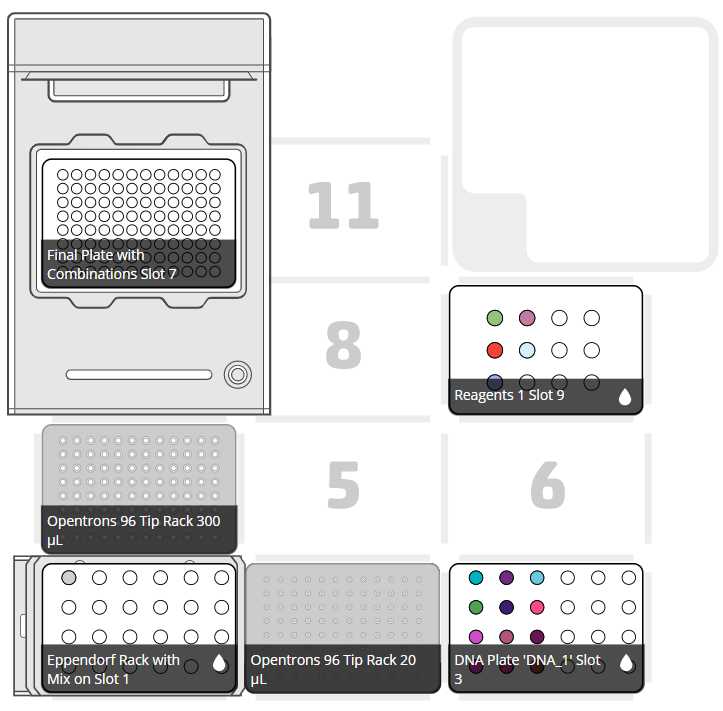 - Distribute DNA parts to the corresponding wells (as many transferrings as set in the combinations sheet)