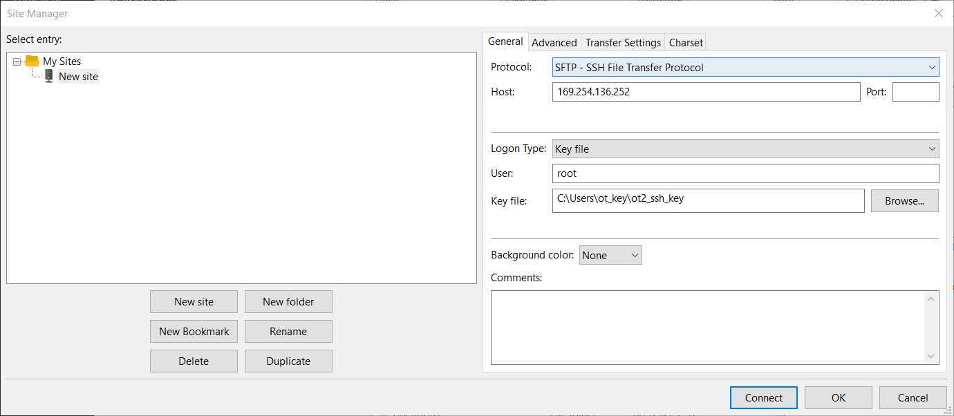 Go to File -> Site Manager -> New Site -> Change Protocol to SFTP . Then, introduce in Host the OT IP, change the Logon Type to key file, change User to root and give the directory where the ot key is. It should look something like this
