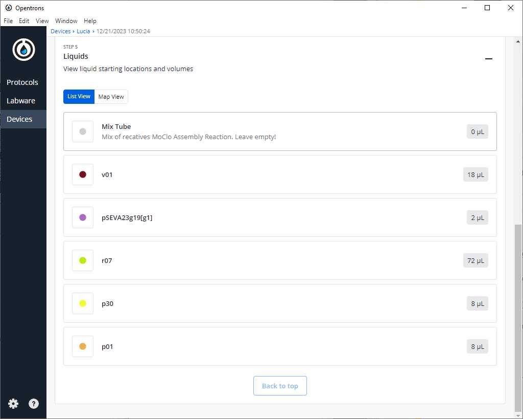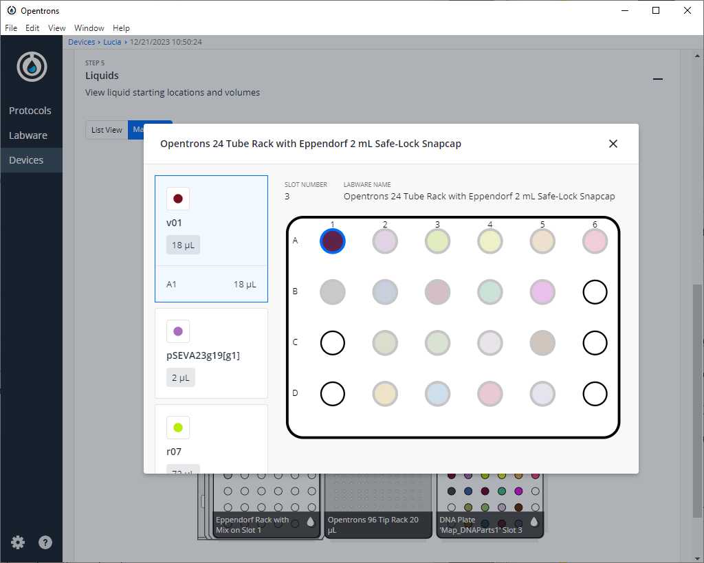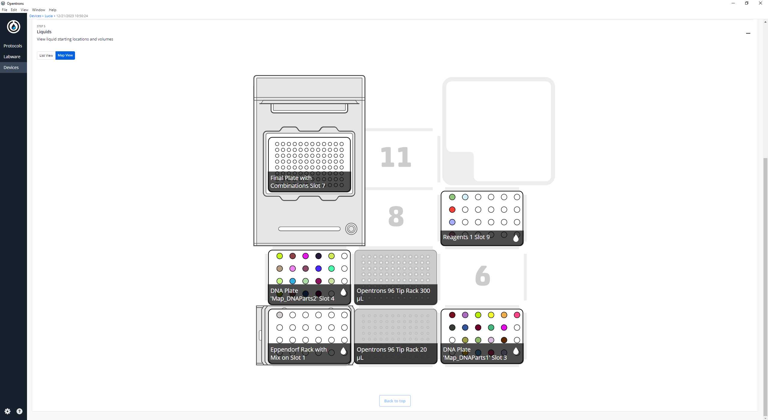 After clicking on Proceed to Setup, you should obtain, if there is no error, the positions of the labware in the Labware tab and the reagents, with their corresponding volume in the Liquids tab.