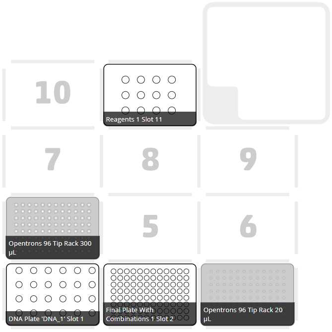 - Combinations: set of combinations that are going to be created in the final wells, one combination per row and one DNA part per cell
