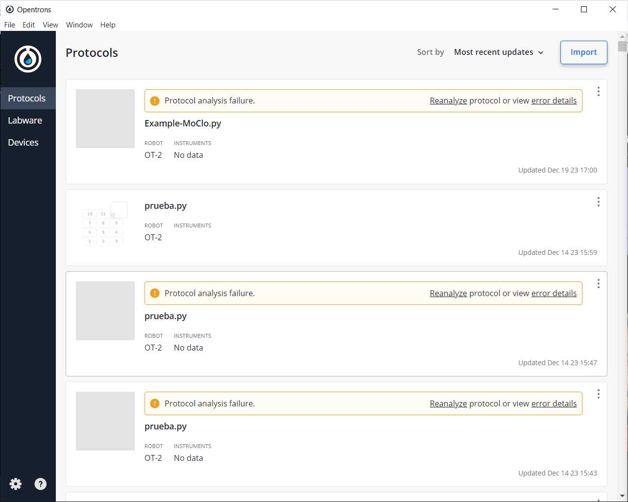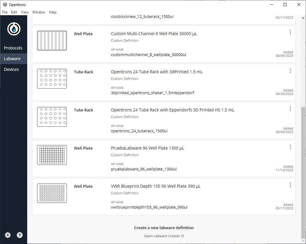 In the OT app, we need to perform the following route: Labware -> Import -> Choose File -> Select file we have created in step 3.1