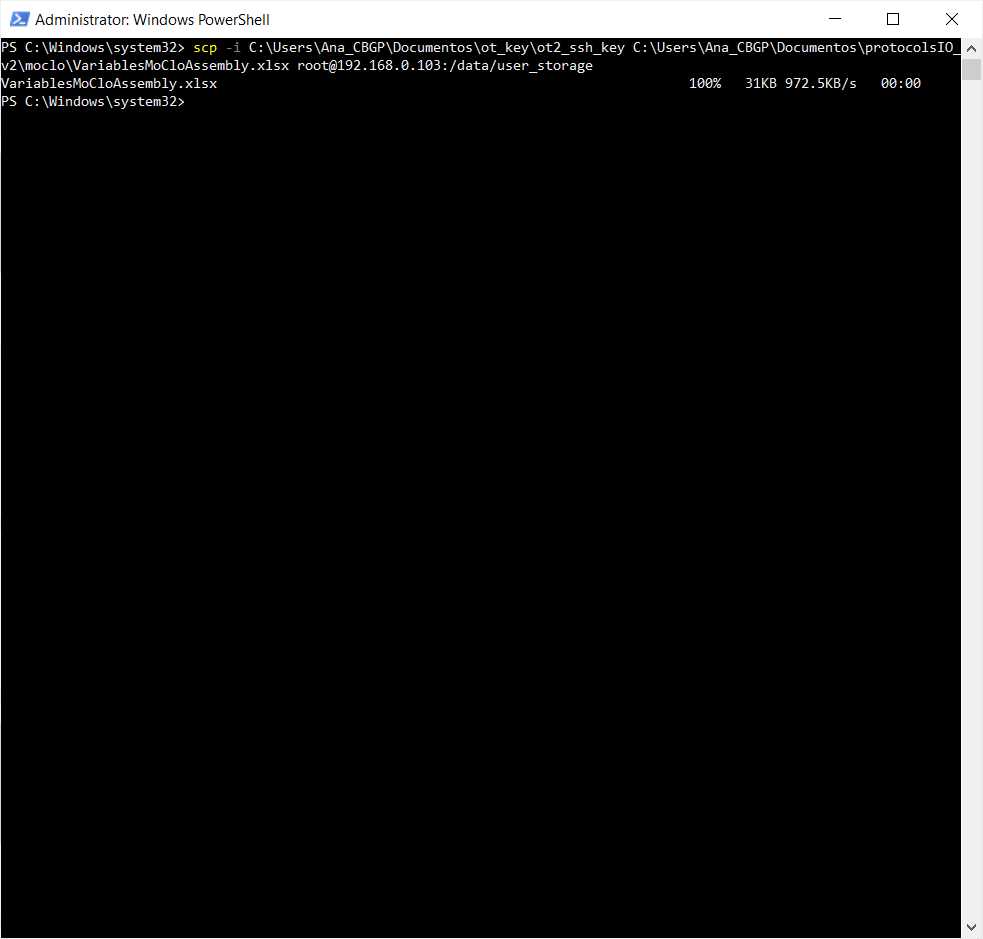 We will use the command line with scp to transfer the file VariablesMoCloAssembly.xlsx to the OT system.