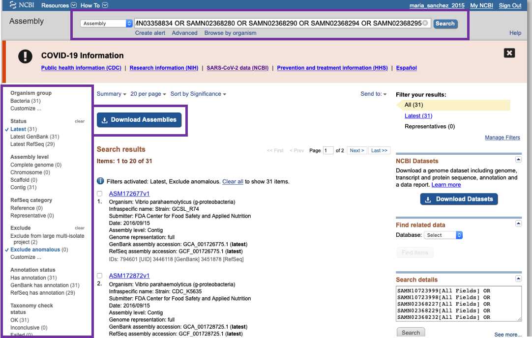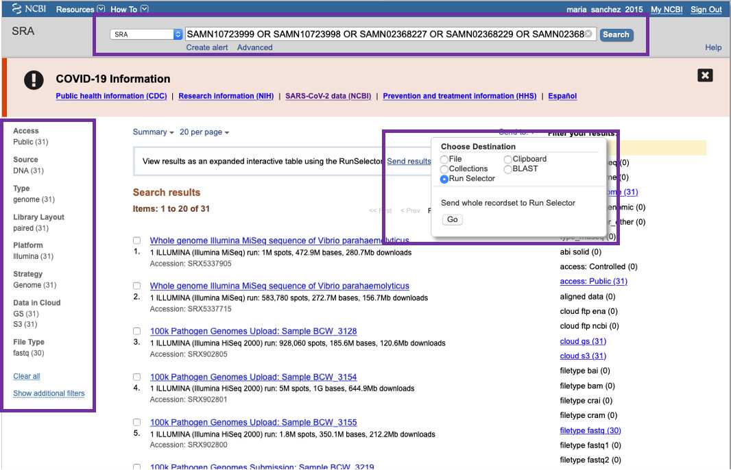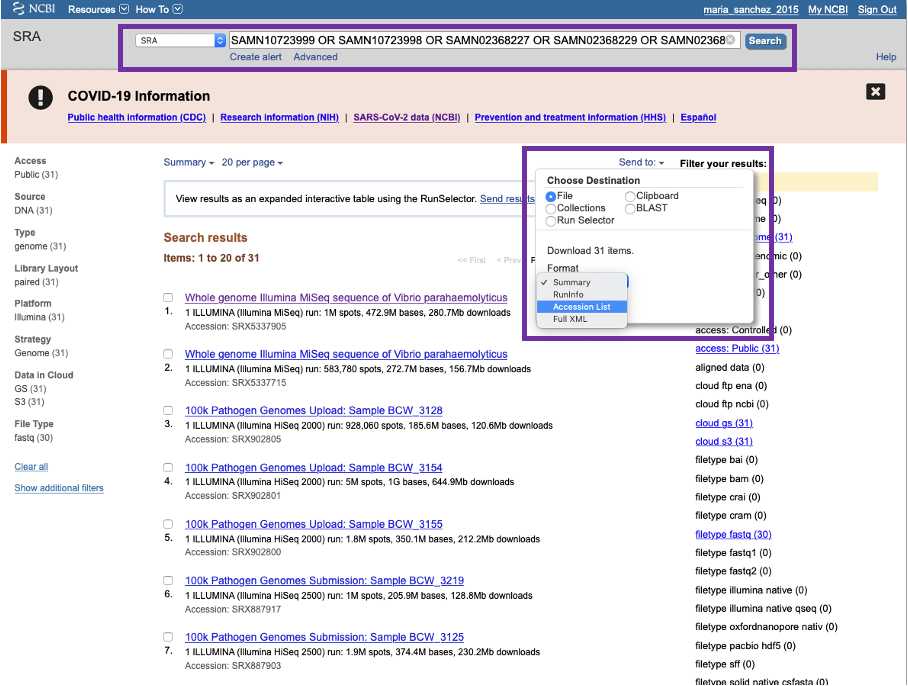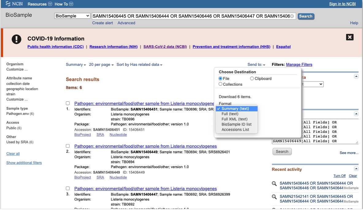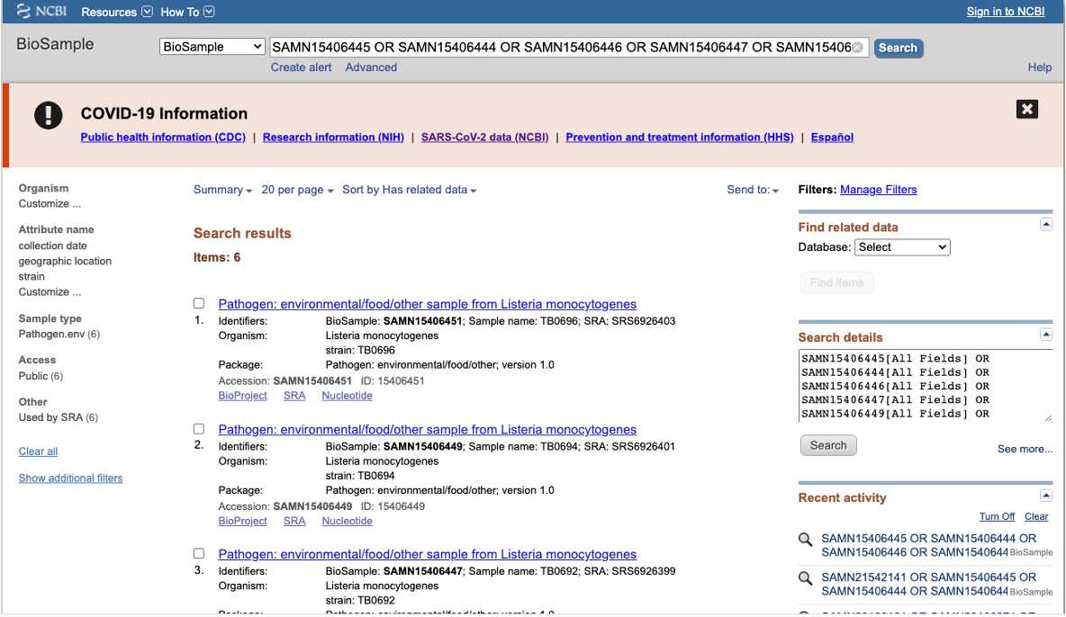 This protocol describes methods to query GenomeTrakr sequencing records and metadata across multiple NCBI resources: BioSample, BioProject, Sequencing Read Archive, Pathogen Detection and Assembly databases.