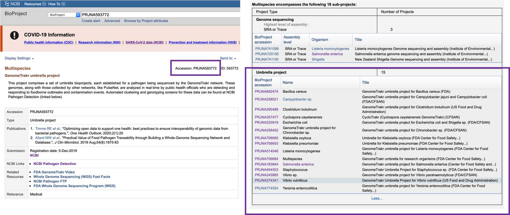 BioProject is a collection of biological data related to a surveillance or research effort. Umbrella bioprojects contain several data-level projects. PRJNA593772 ( https://www.ncbi.nlm.nih.gov/bioproject/593772) comprises a set of umbrella bioprojects, each established for a pathogen being sequenced by the GenomeTrakr network. If you need to find a BioProjects for an specific organism processed by your lab, click at the corresponding organism umbrella Bioproject.