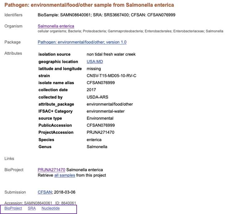 BioSample (https://www.ncbi.nlm.nih.gov/biosample/ ) is the database for the isolate or sample metadata. Users access biosample records at using the search box and typing laboratory identifiers ( strain, isolate name alias, FDA_Lab_ID, BioProjects) or specific attributes separated by " OR " e.g. "CFSAN0001 OR CFSAN0002 OR CFSAN0003" "Salmonella enterica".