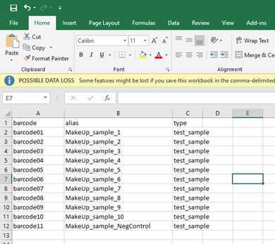 - A sample sheet in csv (comma separated values) format with the columns "barcode", "alias", "type".
