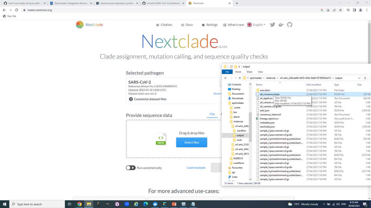 Open the webpage https://clades.nextstrain.org/, select SARS-CoV-2 and drag and drop your consensus sequences into it.