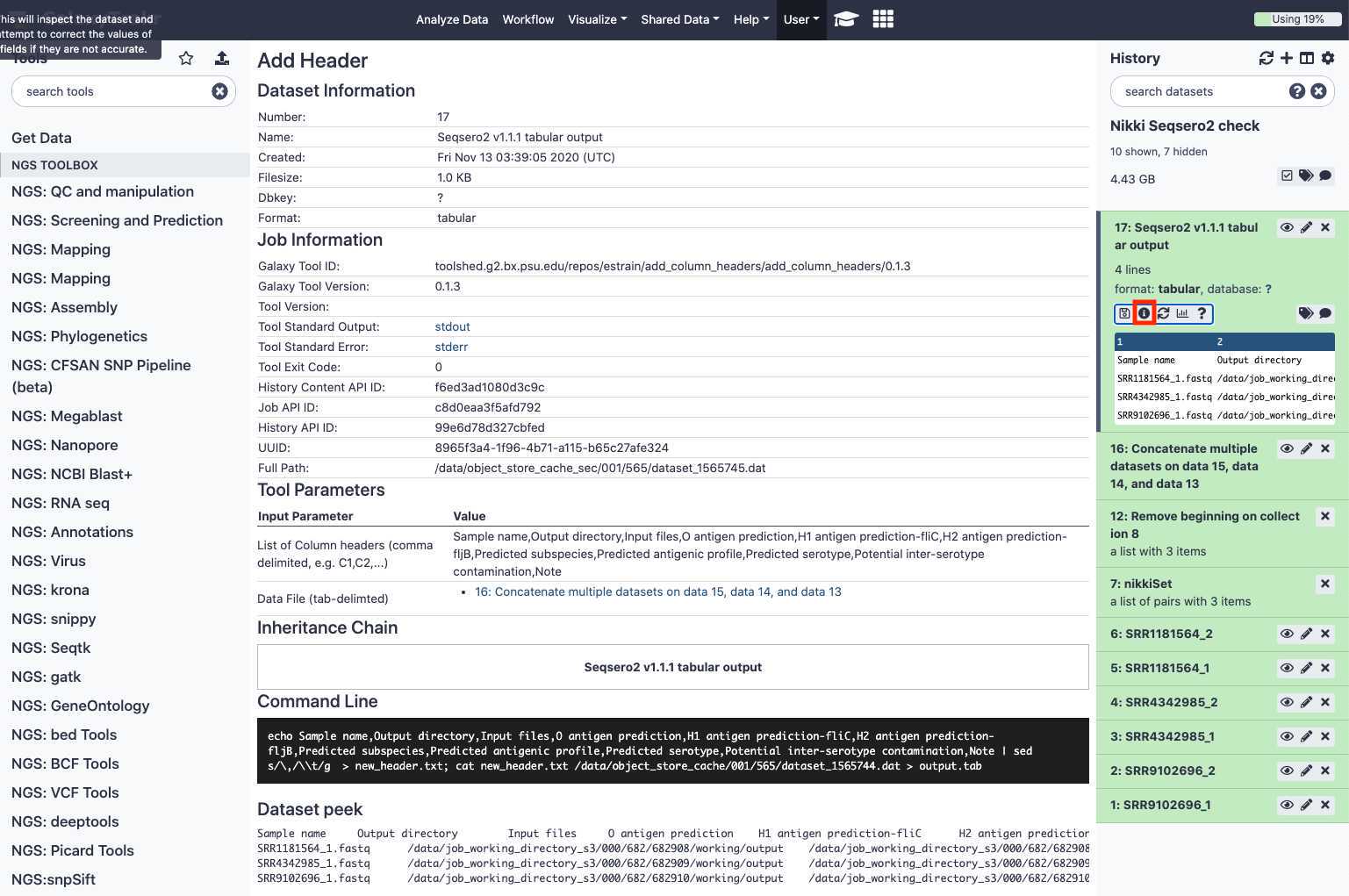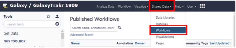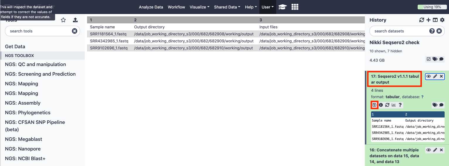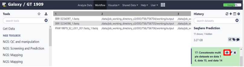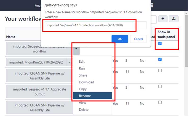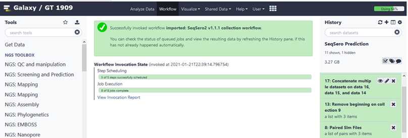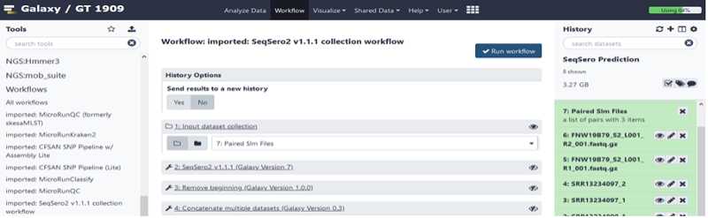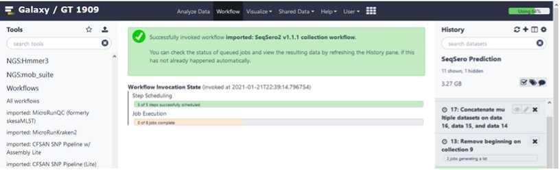 This will move the Seqsero2 v1.1.1 collection workflow into your tools panel permanently and you will now have this workflow available to you every time you log into GalaxyTrakr.