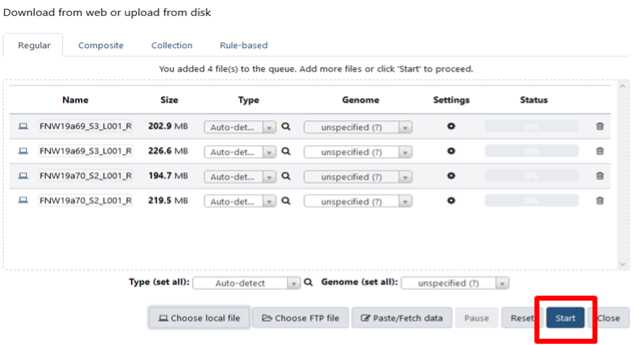 Find your WGS fastq.gz files and select those (2 data files: Read 1 and Read 2 per organism).