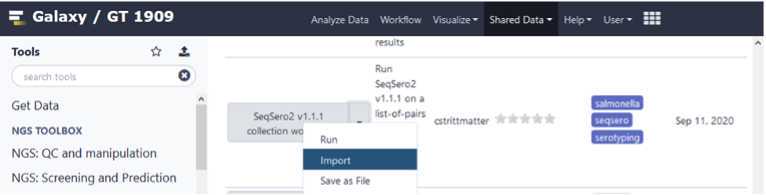 Import the SeqSero2 workflow into the Tools Panel