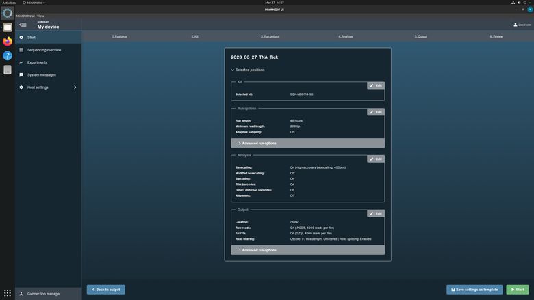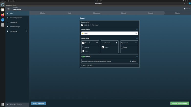 Select the output data location, format, and filtering options. Check up the box for Raw reads in POD5 format and Basecalled reads in FASTQ format. Keep the filter score as the system default.