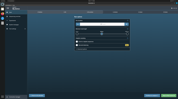 Set run length to 48h 0m 0s and minimum read length 200 bp. Let adaptive sampling be unchecked.